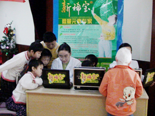 我企業(yè)董事長(cháng)湯傳忠先生與福利院兒童的合影 我企業(yè)員工正在為福利院兒童進(jìn)行微量元素檢測