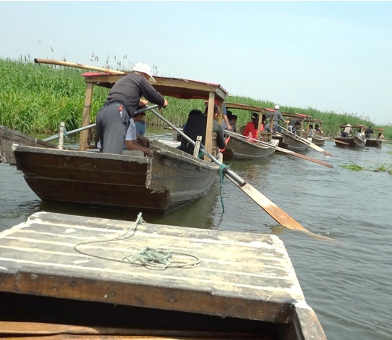 上午10:00,經(jīng)過(guò)2個(gè)多小時(shí)的路程我們到達(dá)本次旅游的目的地——東平湖。等大家依次從大巴車上下來(lái)時(shí),發(fā)現(xiàn)5位當(dāng)?shù)氐臐O民早已劃著小船等候在岸邊,伴隨著一首慷慨激昂的《好漢歌》,大家開(kāi)始泛舟湖上,鮮紅的新稀寶大旗第一次飄揚(yáng)在廣闊的東平湖上。