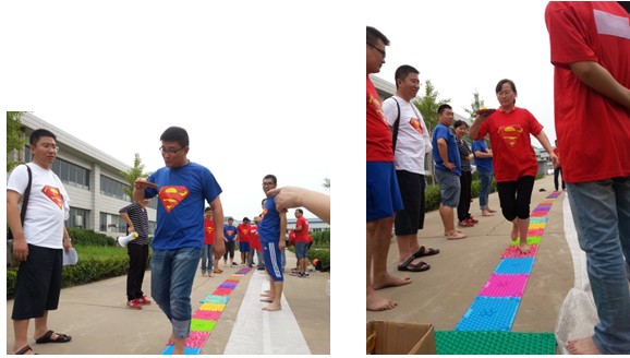“心有靈犀”結(jié)束后,藍(lán)隊(duì)紅隊(duì)穿好隊(duì)服轉(zhuǎn)戰(zhàn)到戶外,大家的激情遠(yuǎn)遠(yuǎn)超過了戶外天氣的熱度。主持人剛剛講解完比賽規(guī)則,大家就投入到了比賽活動(dòng)中,一個(gè)個(gè)隊(duì)員光著腳板在指壓板上快速前進(jìn),手上還小心翼翼的用乒乓球拍端著乒乓球,眼睛目不轉(zhuǎn)睛的盯著球拍上的乒乓球,臉上用各種表情來表達(dá)腳板的感覺和對(duì)球拍上乒乓球的關(guān)注。每個(gè)隊(duì)員都成功的端著球走過了指壓板,大家熱烈地討論并分享著自己的感受。