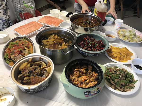 沒想到平時(shí)工作能力杠杠的同事們,做起菜來也絲毫不遜色。沒過多久菜已經(jīng)陸續(xù)上桌,有毛毛做的紅燒魚與水煮牛肉,米粒做的菜包釀、咸蛋炒南瓜;陶大神做的 佛跳墻、蟹黃煲、椰香蝦;潤姐的燒鴨、西芹紅椒炒白果、涼拌木耳;寧寧的炒花甲螺;振宇做的青椒炒肉;芳芳的芒果西米露。一大桌菜色香味俱全、品種多樣, 飯前涼菜、家常炒菜、營養(yǎng)豐盛的大菜以及飯后甜點(diǎn)應(yīng)有盡有。